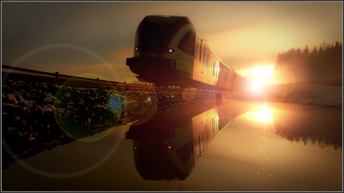 Spät in der Nacht des 28.7.2020 am Bahnhof in Knittelfeld. Ein heftiges Unwetter sorgte für reichlich Wasserlachen am Bahnsteig und ein spontanes Stimmungsfoto entstand.