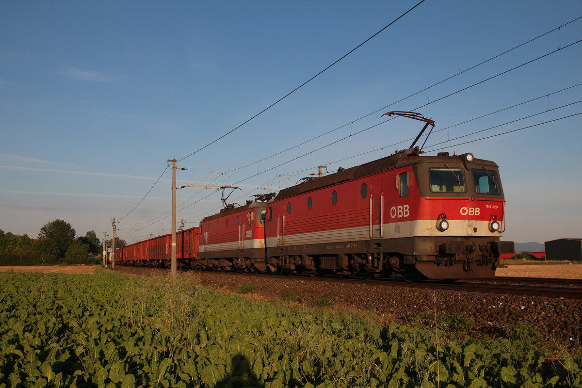 In der ersten Morgensonne des 14.7.2020 stehen die 1144 228 und die 1144 060 mit dem DG54072 von Graz Vbf nach Wien Zvb in Ebenfurth und warten auf die Weiterfahrt dem Ziel entgegen.
