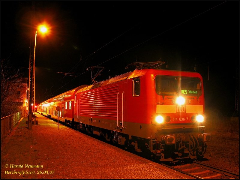 Am Morgen wartet 114 036 mit dem RE38300 nach Jüterbog auf seine Abfahrt in Herzberg(Elster). Normalerweise besteht der Zug aus 143er mit By-Wagen. Heute aber war Streckensperrung durch Bauarbeiten in Falkenberg/E. So pendelte dieser Zug einmal mehr nach Jüterbog. Harald Neumann