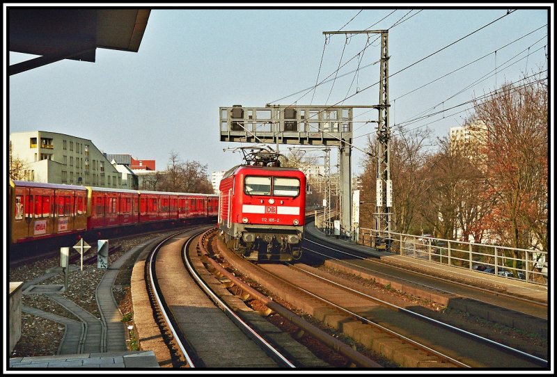 Eine Berliner Spezialität ist der ständige Wettlauf zwischen S-Bahn und Zügen auf den Fernbahngleisen. 112 105 fährt mit dem RE 38174 von Cottbus nach Rathenow, während ein 481er als S7 nach Potsdam unterwegs ist. Florian Böttcher