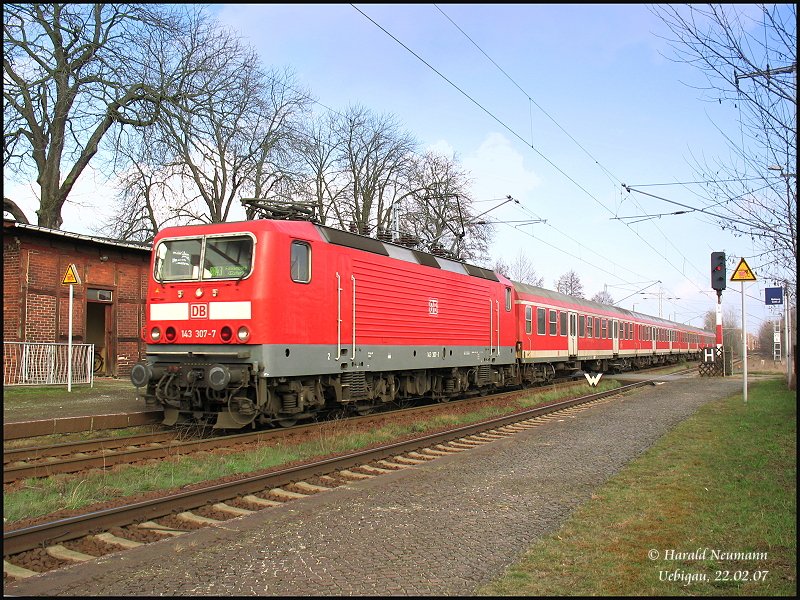 Lok 143 333 strebt mit RB28150 Cottbus - Falkenberg/Elster (RB43) gleich seinem Zielbahnhof entgegen. Hier beim Halt in Uebigau, 18.02.07. Harald Neumann
