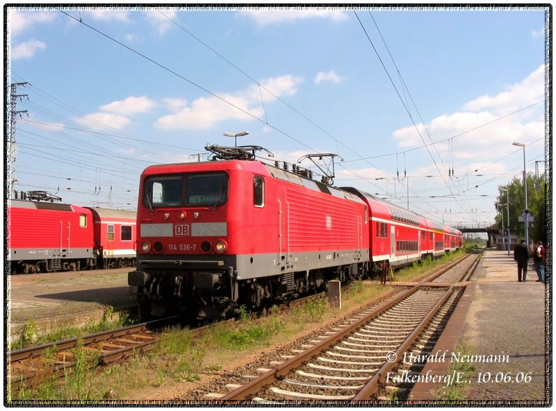114 004 startet mit RE38320 nach Stralsund. Falkenberg/E. , 09.09.06. Im Hintergrund abgestellt: 189 995 die von Railion angemietet ist. Harald Neumann