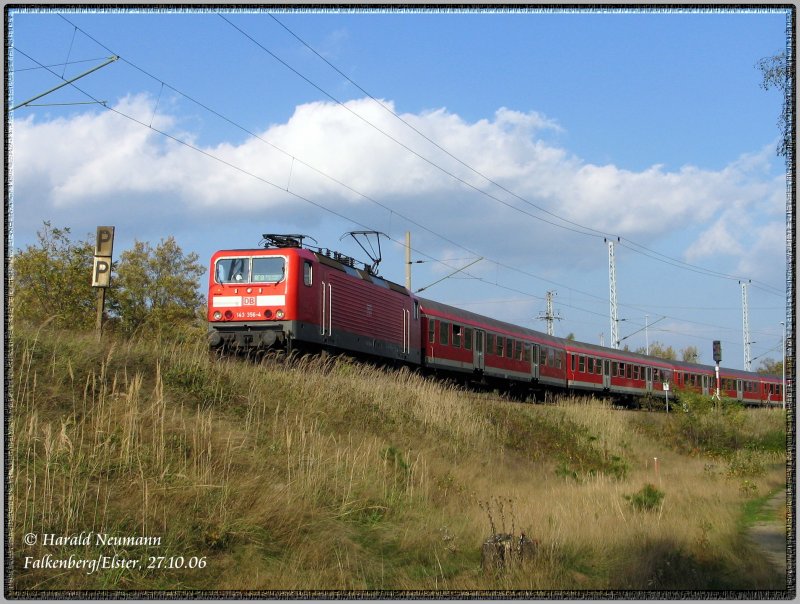 In herbstlicher Nachmittagssonne schleicht 143 356 mit RB28150 Cottbus - Falkenberg(Elster) seinem Zielbahnhof entgegen. Hier muß er noch die mit unbeschrankten Bahnübergängen gepflasterte Schleife vom oberen zum unteren Bahnhof passieren. 27.10.06 Harald Neumann