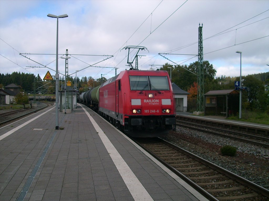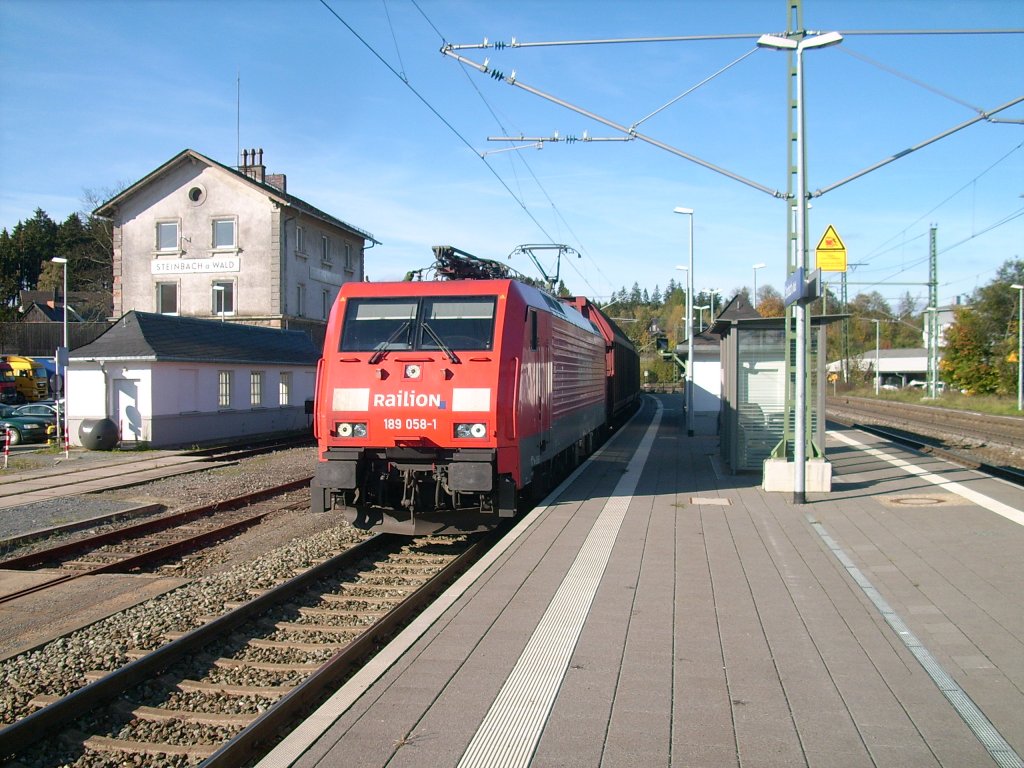 189 058-1 Railion erreicht am 14.10.2011 mit einem schweren gemischten Güterzug den Bahnhof Steinbach am Wald auf der Frankenwaldbahn. Der Zug musste anhalten, da ein ICE noch vorbei musste. Am Zugschluss hing noch eine BR 140 oder BR 151 als Schublok. Normalerweiße sind auf der Frankenwaldbahn ca. 2 Schubloks bzw. Vorspannloks im Einsatz. An diesem Tag waren es insgesamt 4. BR 140, BR 155 und 2x BR 151. Alexander