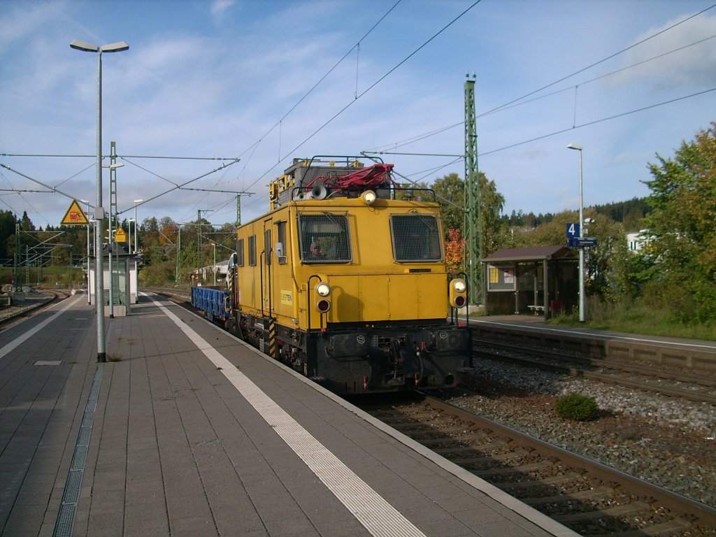 Ein mir unbekanntes Baufahrzeug durchfährt am 09.10.2011 zusammen mit einem Flachwagen den Bahnhof Steinbach am Wald auf der Frankenwaldbahn. Alexander