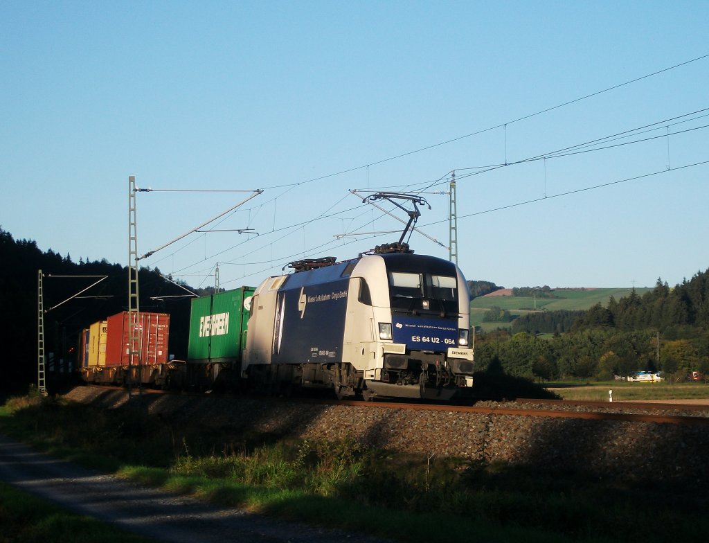 Zwei ES 64 U2 der Wiener Lokalbahnen Cargo GmbH durchfahren am 14.10.2011 mit einem langen Containerzug den Bahnhof Steinbach am Wald auf der Frankenwaldbahn. Am Zugschluss hing wieder eine BR 151 als Schublok. Alexander