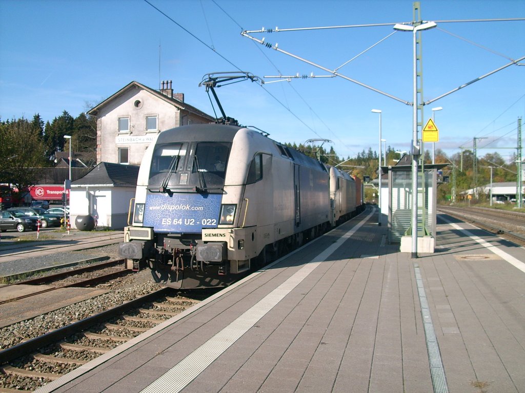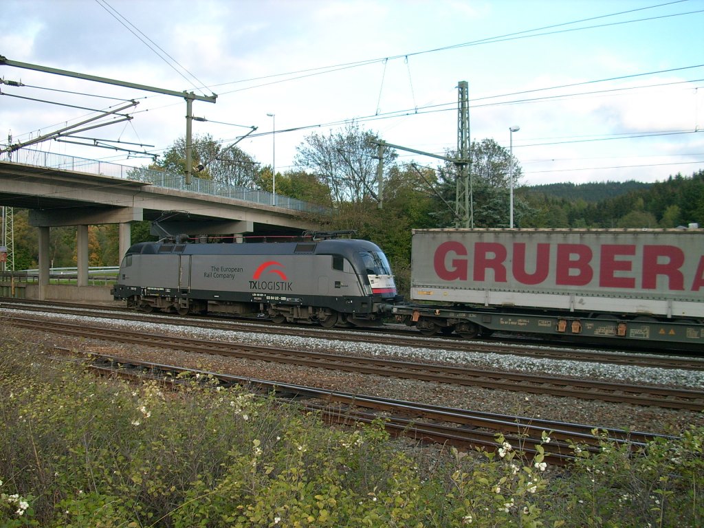 ES 64 U2 der TXLogistik steht am 09.10.2011 mit einem GRUBER/DHL/DFDS Transport/Blue Cargo KLV (Sattelaufliegerzug) im Bahnhof Pressig-Rothenkirchen. Alexander
