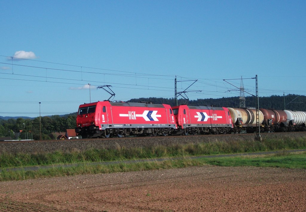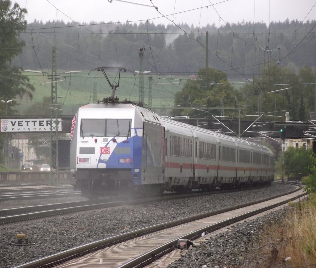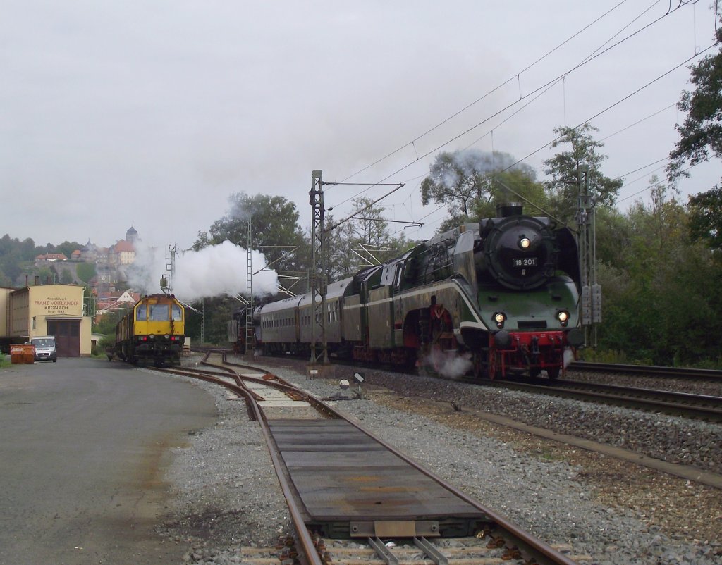 18 201 dampft am 23. September 2011 mit zwei DR-Wagen sowie der 03 1010 als Lr 91929 (Nossen/Halle - Naumburg - Nürnberg) durch das Kronacher Stadtgebiet. Frankenwaldbahner