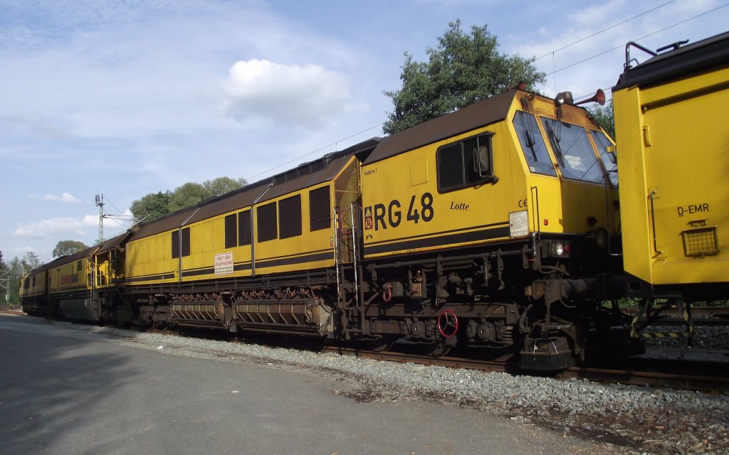 Die Schleifmaschine RG 48 der Schweerbau steht am 11. September 2011 mit einem Begleitwagen der Bauart "Tbis" im Stadtgebiet von Kronach abgestellt. Frankenwaldbahner