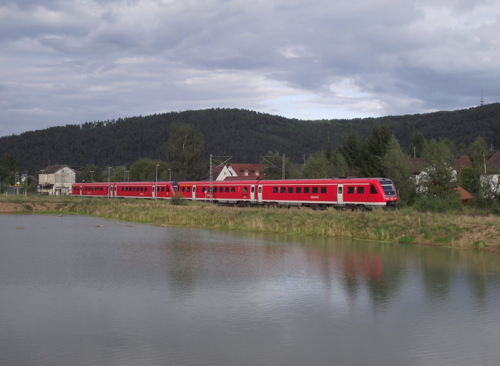 Eine 612er Doppeltraktion verlässt am 28. August 2011 als RB von Pressig-Rothenkirchen nach Bamberg den Haltepunkt Neuses (bei Kronach). Frankenwaldbahner