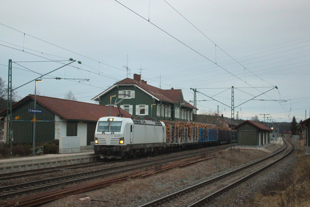 185 105 und 185 124 mit dem EZ 45014 (Singen-Mannheim) in St.Georgen (04.03.23). Dieses Foto entstand vom Bahnsteig!