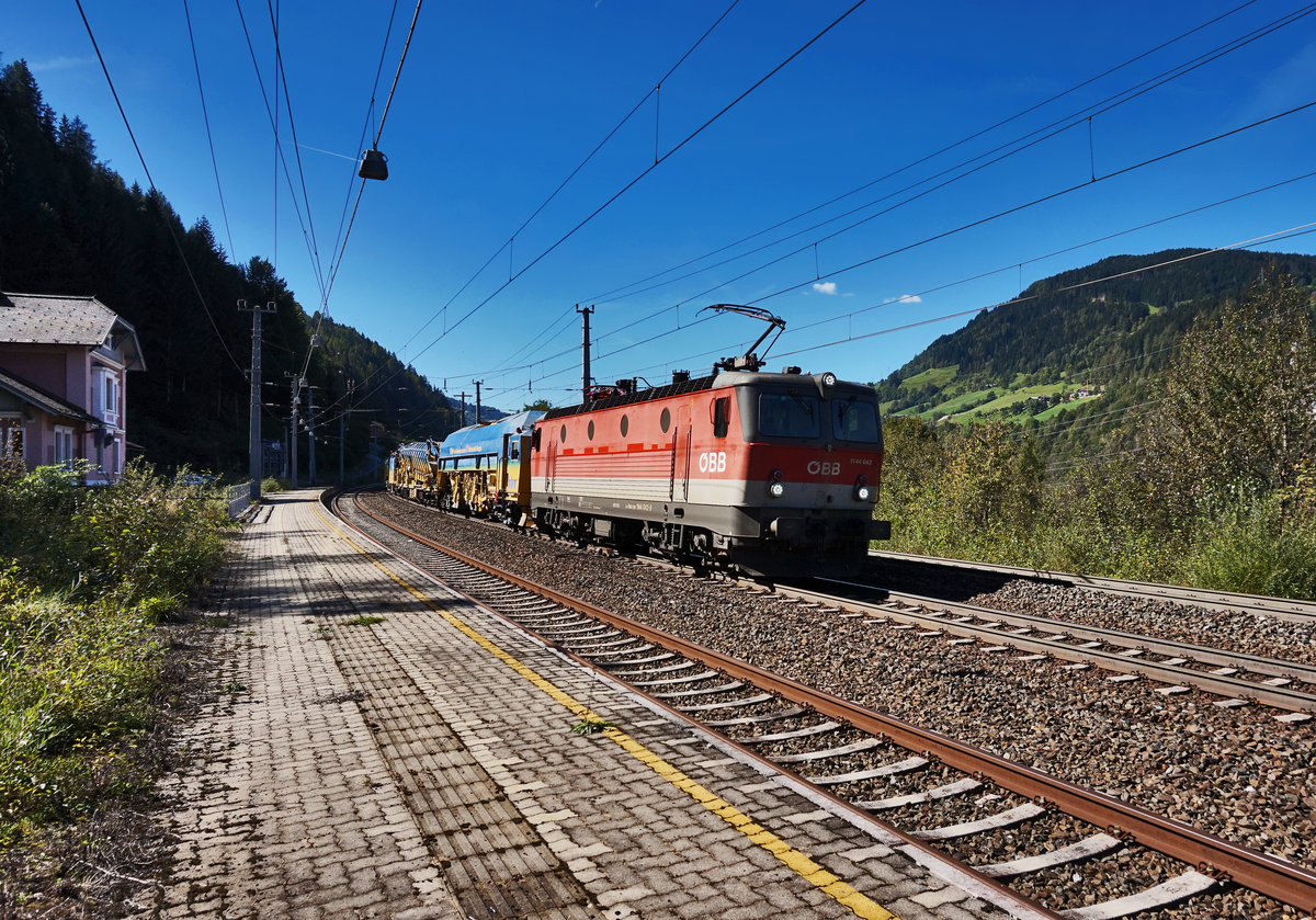 Eine Vierfach Traktion bestehend aus 1116 125-6 sowie drei 1144ern, donnert bei Haltestelle Oberfalkenstein solo den Tauern hinunter.