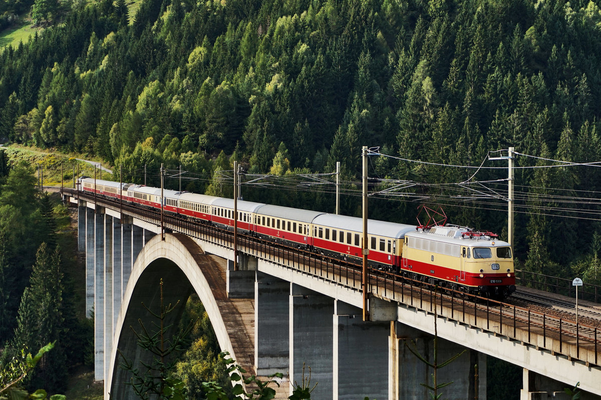 E10 1309 überquert mit dem AKE-Rheingold die Pfaffenberg-Zwenberg-Brücke bei Penk.