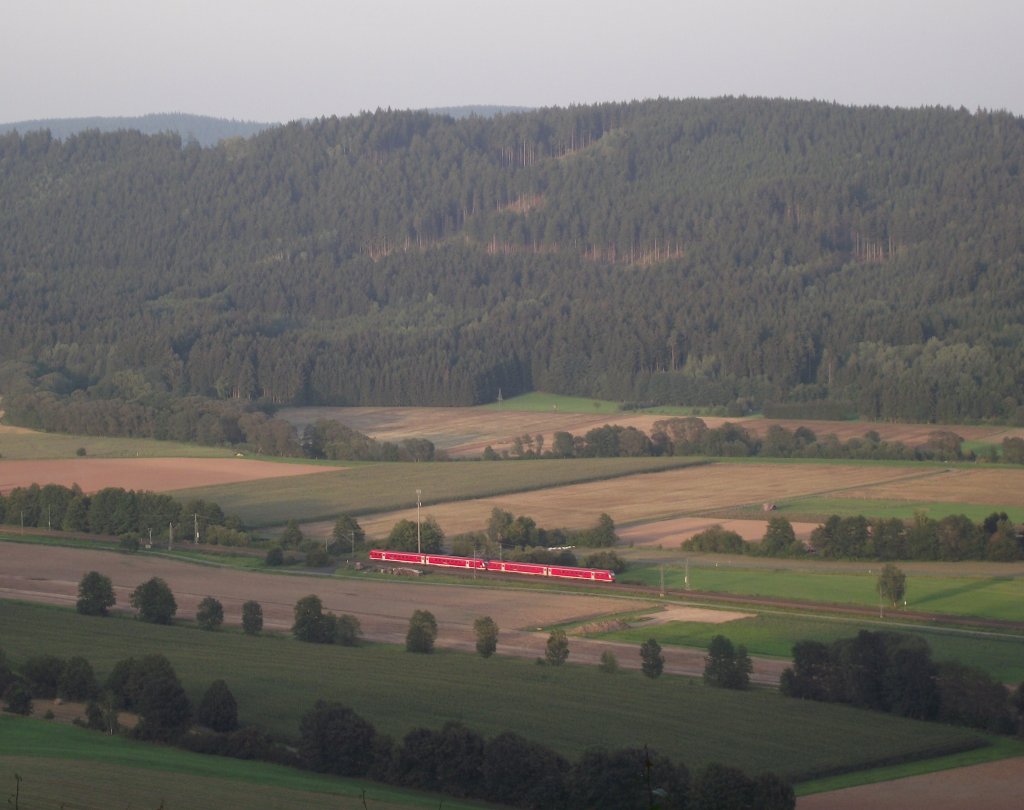 Eine 612er Doppeltraktion ist am 22. August 2011 als RE von Lichtenfels nach Saalfeld auf der Frankenwaldbahn bei Pressig unterwegs. Frankenwaldbahner