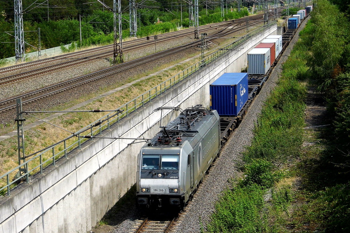 CTL Logistics GmbH mit ihrer akiem "186 261-4" [NVR-Number: 91 80 6186 261-4 D-AKIEM] und Ganzzug Schiebewandwagen Richtung Frankfurt/Oder weiter nach Polen dann am 04.08.17 Bf. Berlin-Hohenschönhausen. Lothar Stöckmann