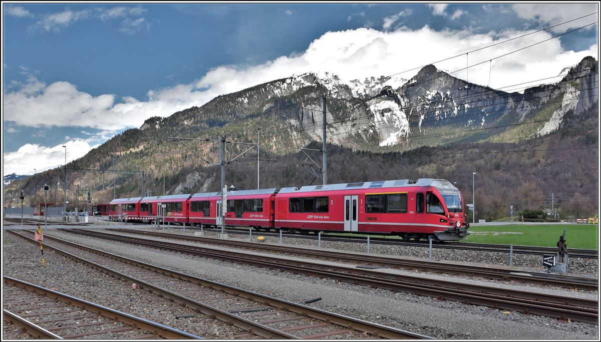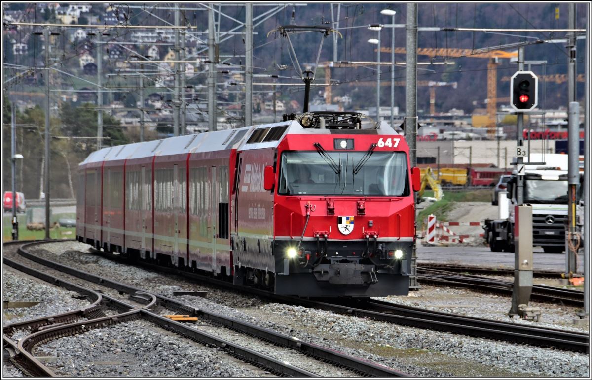 Durchblick durch die frisch renovierte Strassenbrücke über den Rhein auf IR1136 nach Chur mit der Ge 4/4 III 644 "Savognin". (29.04.2018) Herbert Graf