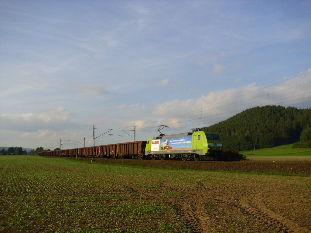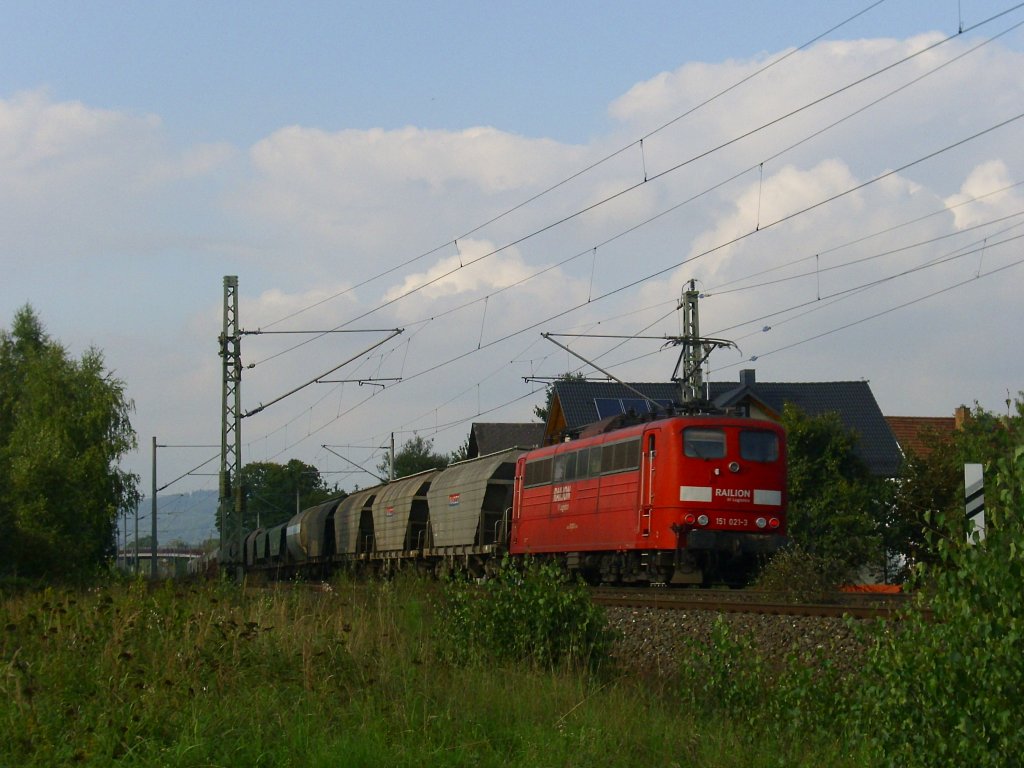 Farbsonderling 151 021-3 schiebt am 10. September 2010 den LTE Getreidezug über die Frankenwaldrampe. Aufgenommen bei Stockheim (Oberfranken). Frankenwaldbahner
