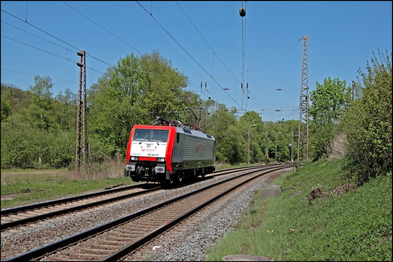 185 228 bringt den Aluminumbrammenzug 47731 Richtung Kreuztal und durchfährt den ehemaligen Haltepunkt Einsal. Ziel des Zuges wird die Schweiz sein. (30.04.2008) Florian Böttcher