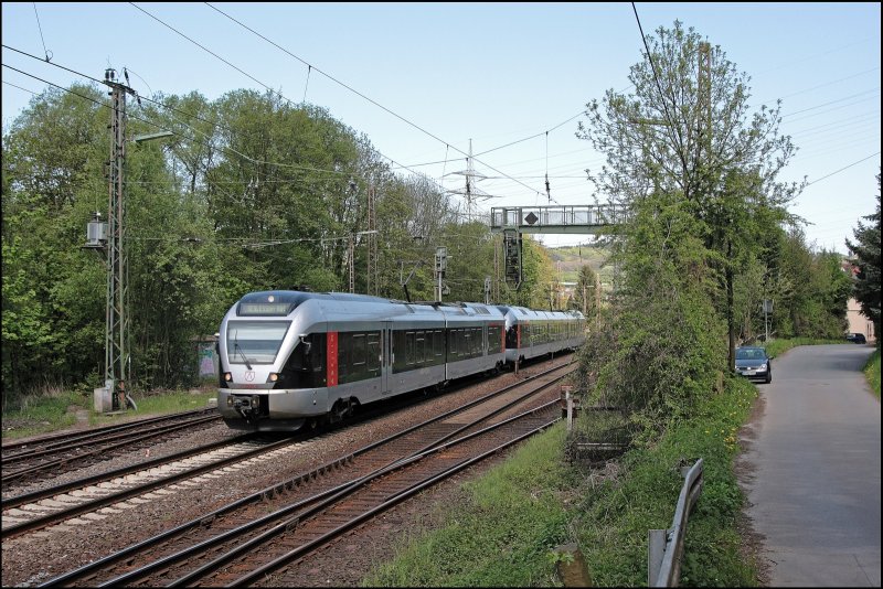 Was diese Jugendlichen bzw. Kinder (zwei von ihnen sind nach dem Aussehen zu urteilen höchstens 14 Jahre) machen ist das allerletzte!!! Würden das die Eltern sehen...... ET22004 und ET22007 verlassen, mit dem Einsatz der Hupe, den Bahnhof Hohenlimburg als ABR99734, (RB91 "Ruhr-Sieg-Bahn") nach Siegen/Iserlohn. (02.05.2008)