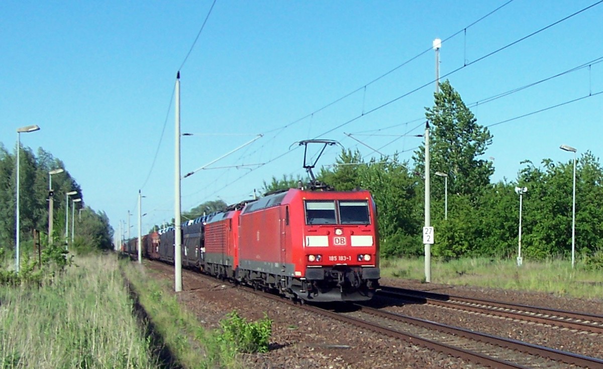 31.5.2015, ehemaliger Bf. Schönwalde am nordwestlichen Berliner Außenring, Teil2: Die alten Bahnsteige sind noch vorhanden. Die früheren Überholungsgleise, an denen die Bahnsteige lagen, wurden mitsamt Weichen wegoptimiert, Fußgängerbrücke und kleines Empfangsgebäude abgerissen, lediglich die Lampen und die Lautsprecher an den Bahnsteigen weisen noch darauf hin. Die alten Masten mit ihren Quertragwerken , die die 4 Gleise überspannten wurden durch normal Betonmasten ersetzt. Fast Punkt 18.00Uhr kommt DB 185 183-1 vor einem gemischten Güterzug aus nördlicher Richtung ins Bild. Hinter der Lok lief abgebügelt noch eine unbekannte 189 mit. Andreas Bogott