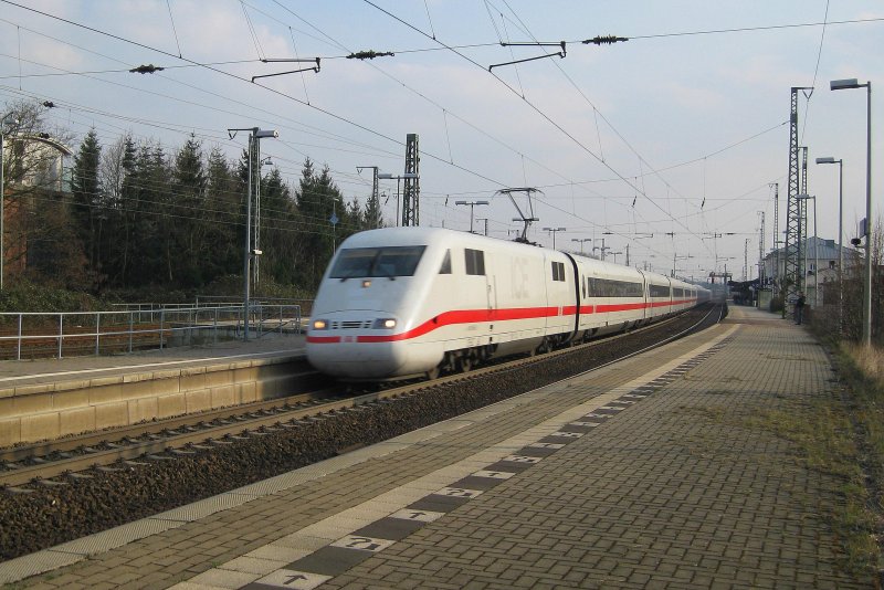 ICE auf Abwegen. Wegen der Bauarbeiten zwischen Rastatt und Karlsruhe weicht der ICE (hier mit Triebkopf 401 089-8) auf die Strecke über Ettlingen aus, ab dem 29. März 2009. Dadurch verlängert sich das Nadelöhr zwischen Baden-Baden und Rastatt bis nach Karlsruhe. (29. März 2009, 19:27) Olli