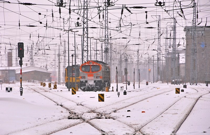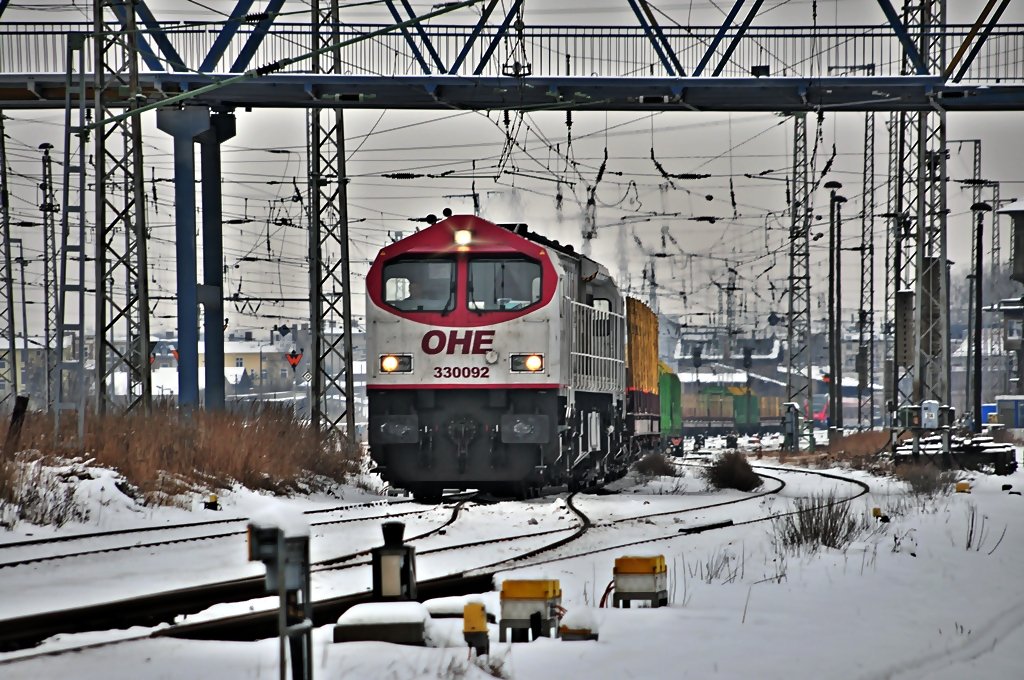 Am Sonntag Abend donnerte der OHE Tiger 330092 mit einem Containerzug in Fahrtrichtung Norden durch Eschwege West. Aufgenommen am 07.02.2010. Jens Baumhauer