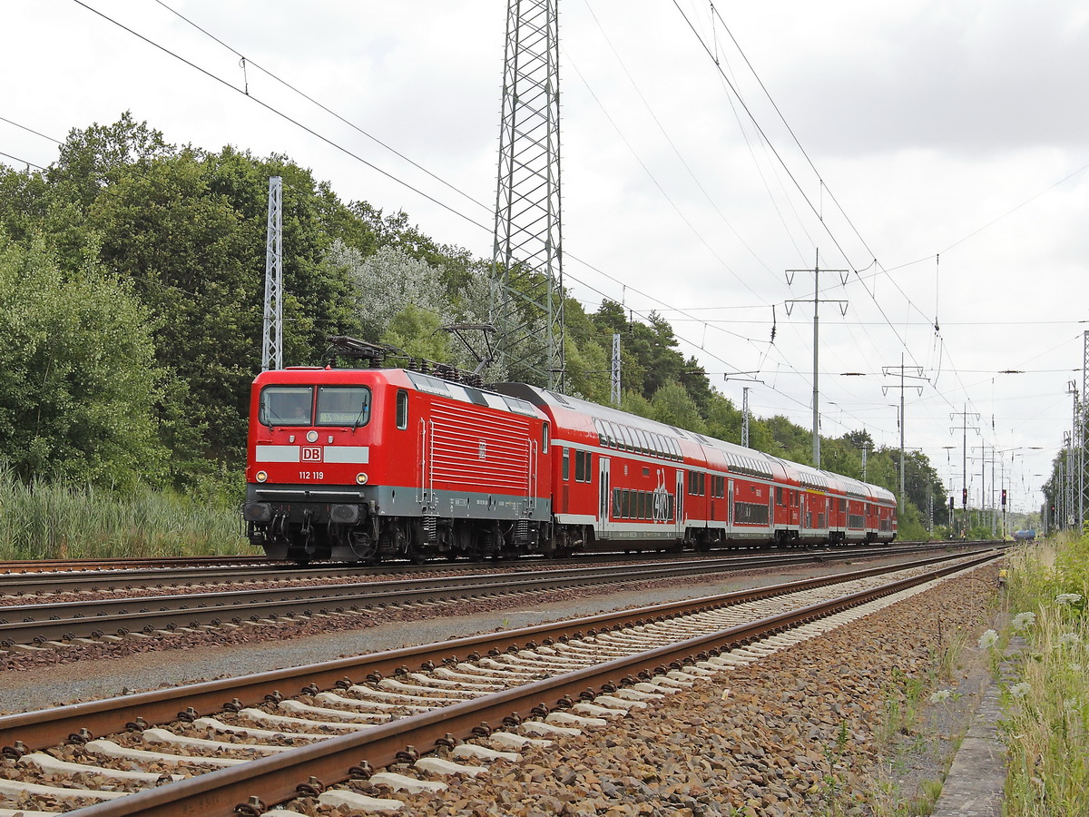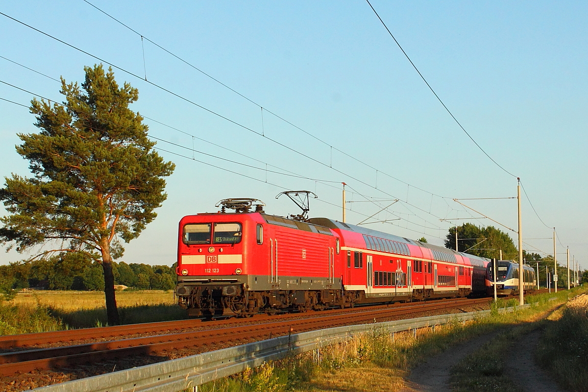 Die 112 123 mit dem RE 5 nach Stralsund trifft am 28.06.2019 den Talent der NEB auf der RB 12 nach Berlin Ostkreuz in Nassenheide.
