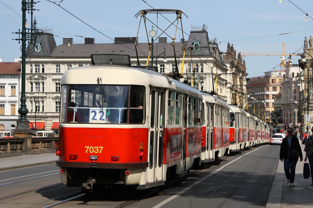 Tatra T3R.P - Wagen 3037 zusammen mit unzähligen Wagen auf der Brücke Most legii. An der Haltestelle Národní divadlo gab es kurz zuvor einen kleineren Zwischenfall und die Strassenbahnen stauten sich von allen Seiten für ca 15 Minuten. Flo Weiss