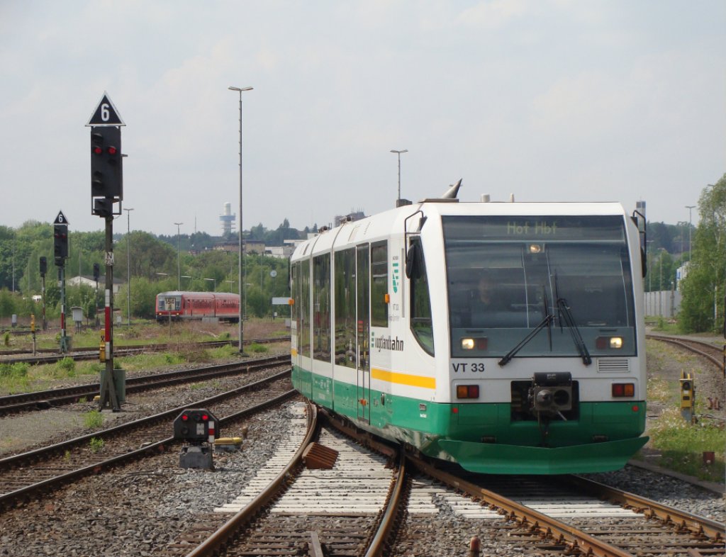 Regiosprinter der Vogtlandbahn waren im Auftrag der Deutschen Bahn AG zwischen Lichtenfels und Neuenmarkt-Wirsberg unterwegs. Am 11.5.11 hielt VT 32 nach Lichtenfels vor dem nicht mehr zu Bahnzwecken genutzten Untersteinacher Empfangsgebäude.