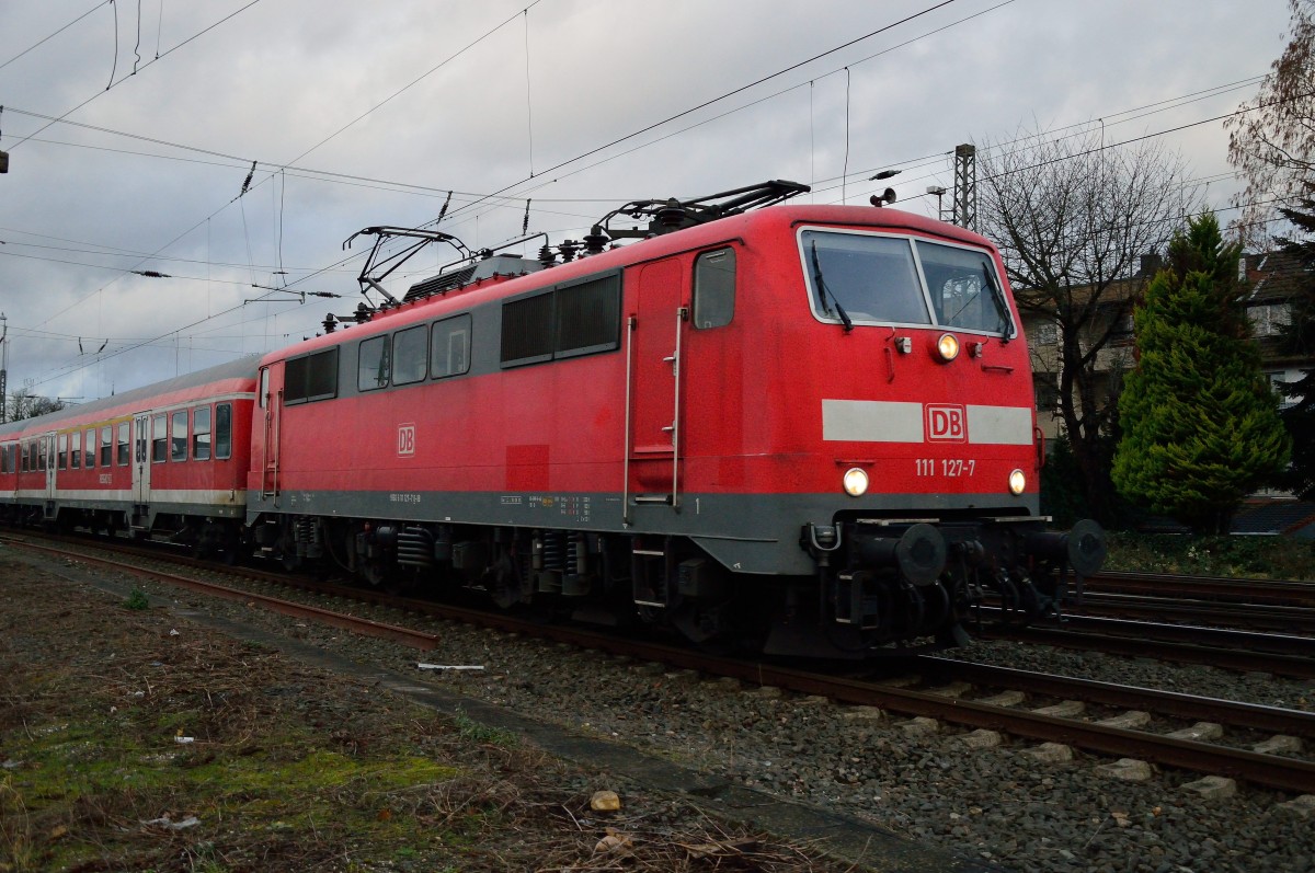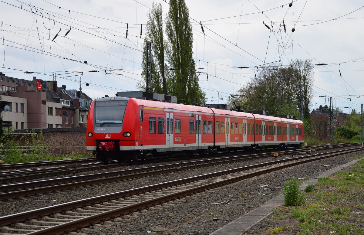 Auch am heutigen Samstag ist die 111 117 wieder mit einem Dostock nach Aachen als RE 4 nach Aachen unterwegs, hier verlässt der Zug Rheydt Hbf. 25.4.2015 Andreas Strobel