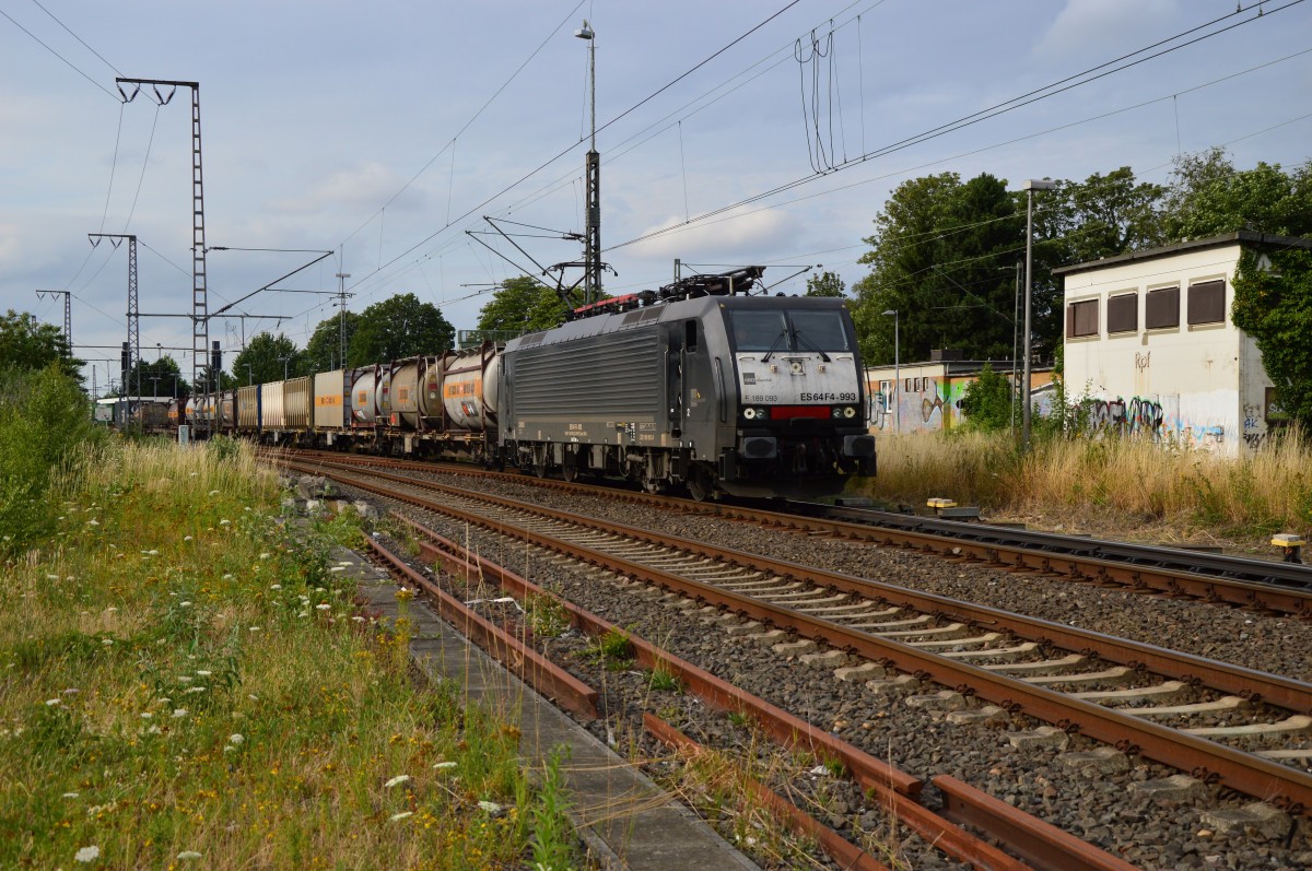 Durch Rheydt kommt am Sonntagabend die 189 993 mit einem Kastelzug und biegt geleich nach Odenkirchen ab in die Kbs 465 gen Köln. 12.7.2015 Andreas Strobel
