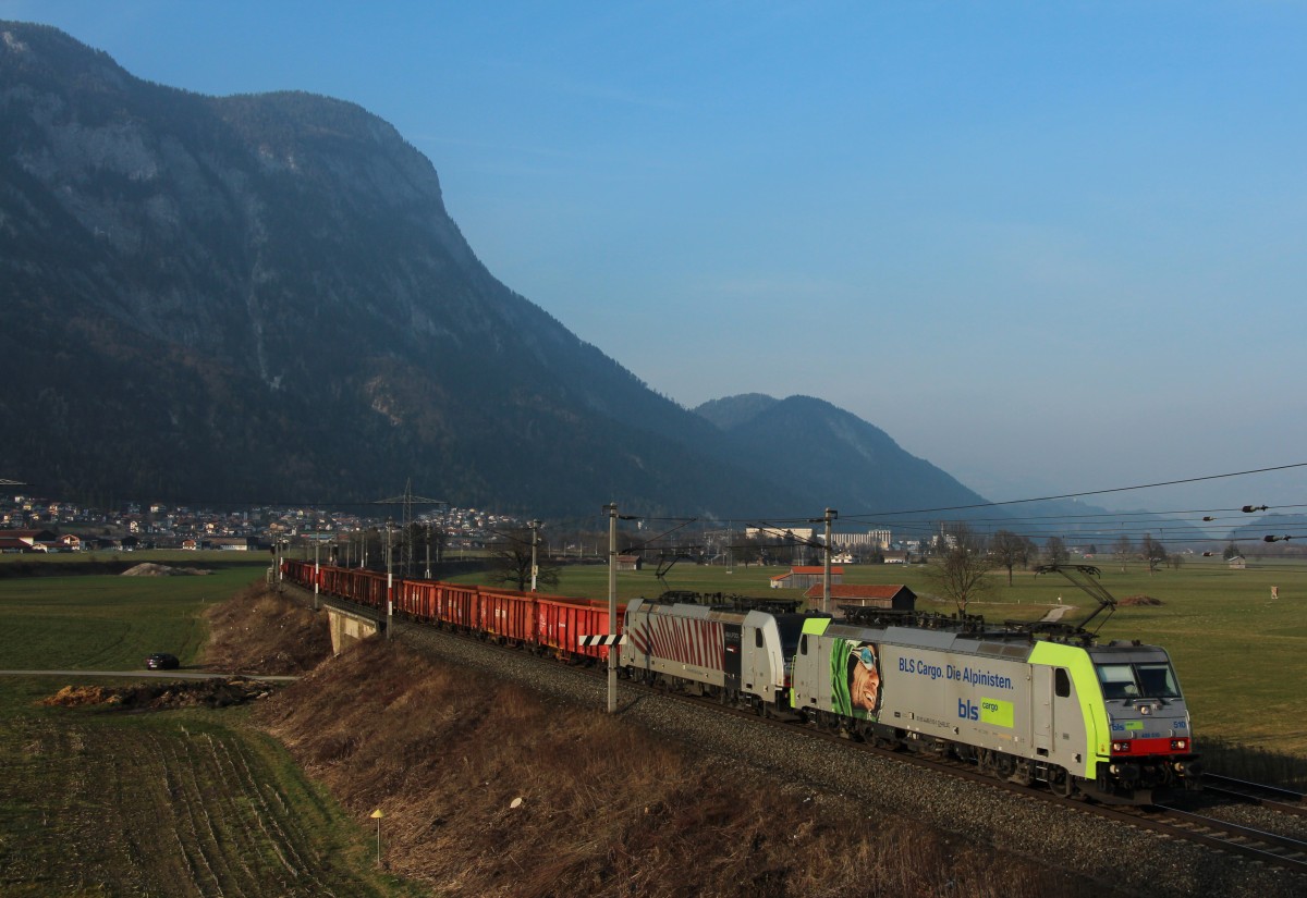 Die von Lokomotion angemieteten Loks aus der Schweiz 482 045-2 SBB Cargo und 486 510-1 BLS kommen am 26.2.2014 als LZ vom Brenner nach Kufstein. Hier bei der Durchfahrt in Brixlegg. Julien Seeling