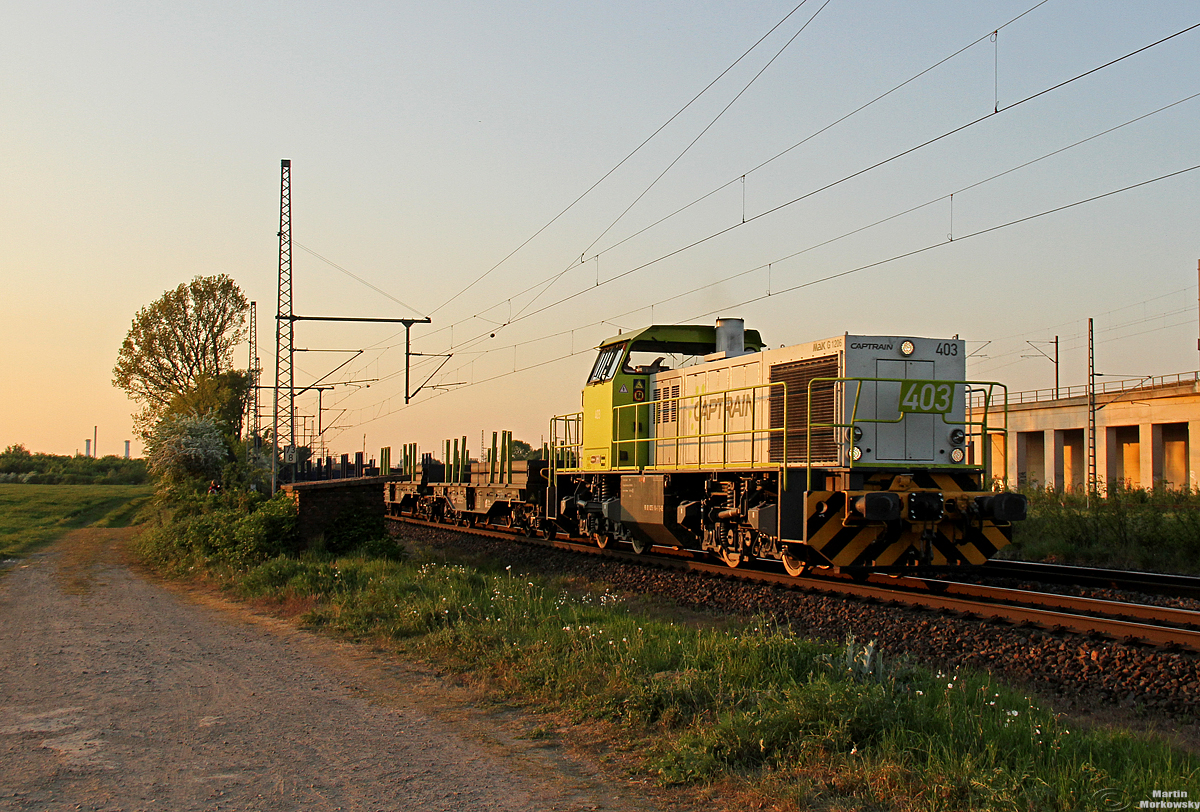 LOCON mit ihrer roten MaK G 1206 (NVR: "92 80 1275 809-2 D-LOCON") und einigen Drehgestell-Flachwagen am 06.05.20 Bf. Mühlenbeck/Mönchmühle bei Berlin. Lothar Stöckmann