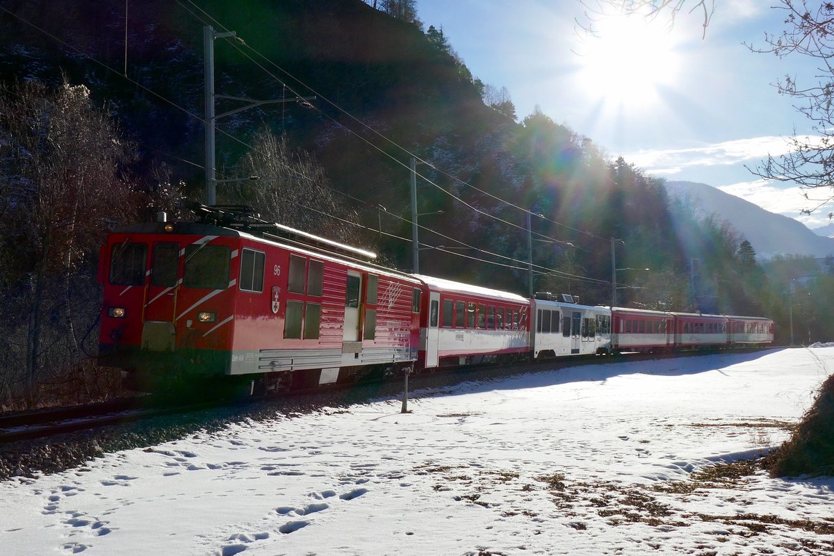 Zuvorderst die MGB Lok Deh 4/4 II Nr. 93 "Oberwald" mit der beiden 2. Kl. Waggons
