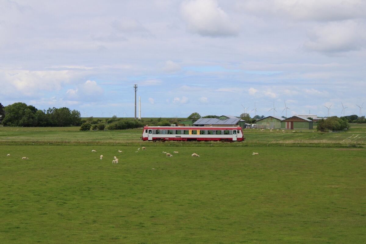 neg 628 071-2 fährt von Dagebüll Mole über die Kleinbahn nach Niebüll und ist hier gerade zwischen Dagebüll Kirche und Blocksberg unterwegs. (30.05.2022) OMSIJakob LP
