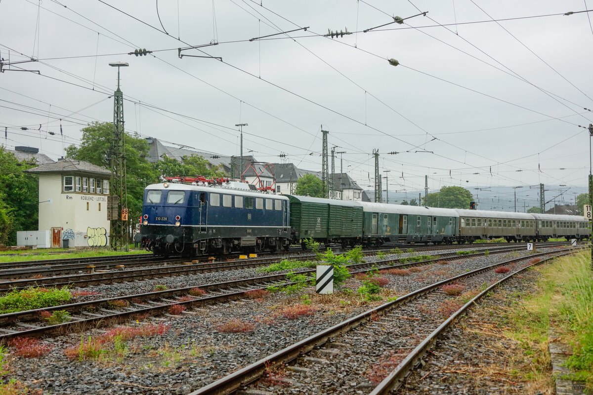 Fast wie in alten Zeiten: Bei strömendem Regen fährt die E 10 228 (DBK Historische Bahn) am 01.06.2024 mit dem historischen Eilzug Nürnberg - Koblenz in Gemünden/Main weiter zum nächsten Halt Lohr/Main. Veranstalter der Fahrt war die Arbeitsgemeinschaft NostalgieZugReisen GmbH in Mülheim an der Ruhr. Ursprünglich war die Schnellzugdampflok 01 1104 als Zuglok vorgesehen, die aber leider durch ein defektes Lager kurzfristig ausfiel. Matthias Kümmel