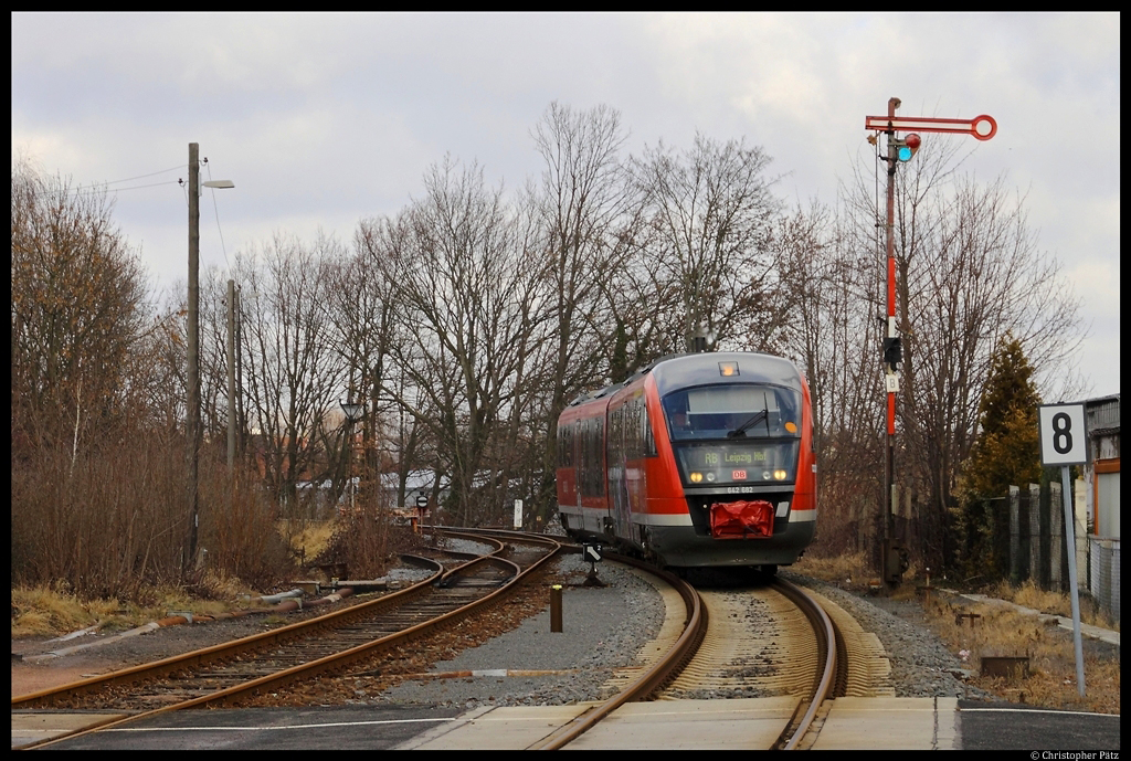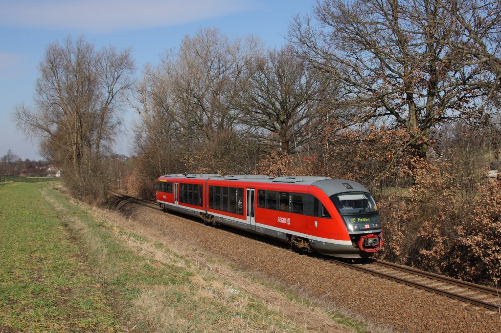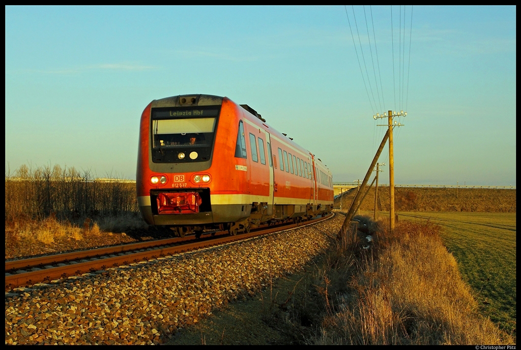 612 037 ist am 20.2.2012 als RB zwischen Meißen und Leipzig im Einsatz. Normalerweise kommen auf dieser Strecke ausschließlich 642 zum Einsatz. Zwischen Grimma und Großsteinberg wird der Zug von den letzten Sonnenstrahlen beleuchtet. Christopher Pätz