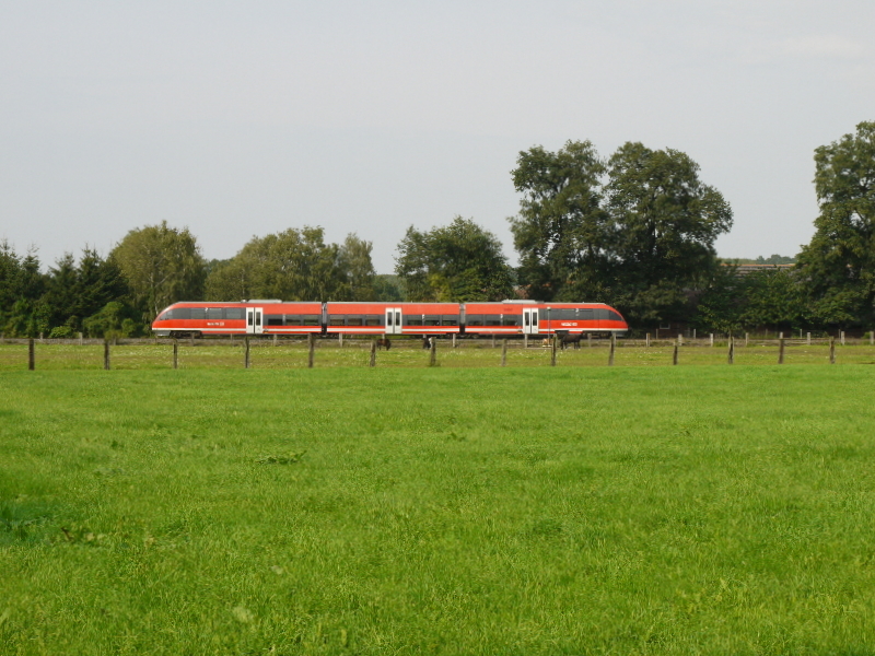 Schön kommt die Sonne gerade hinter eine Wolke hervor als der 643 557 + 643 056 Gronau verlassen und in kürze Ochtrup erreicht. 23.08.2011 Markus Parpart
