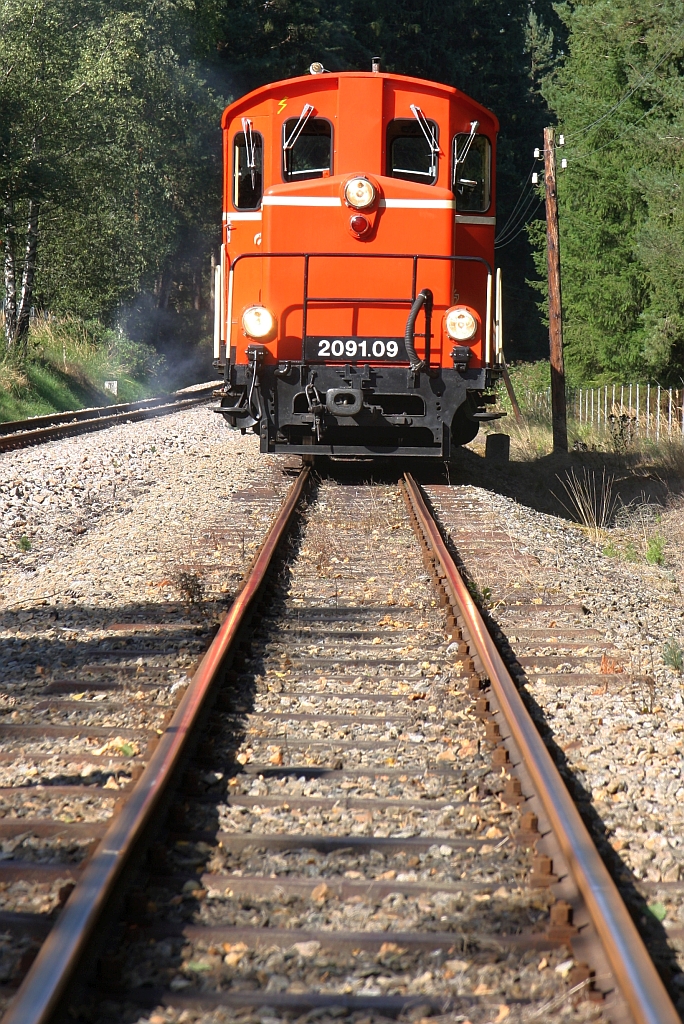 WSV 2091.09 anlässlich des vom WSV veranstalteten 2 tägigen "Güterzugfestival im Wald4tel" am 09.September 2023 beim Km 0,9 der Strecke Alt Nagelberg - Heidenreichstein. - Aufgenommen von der EK Brunnenweg (siehe Geoposition) während eines Fotohalts. Karl Seltenhammer