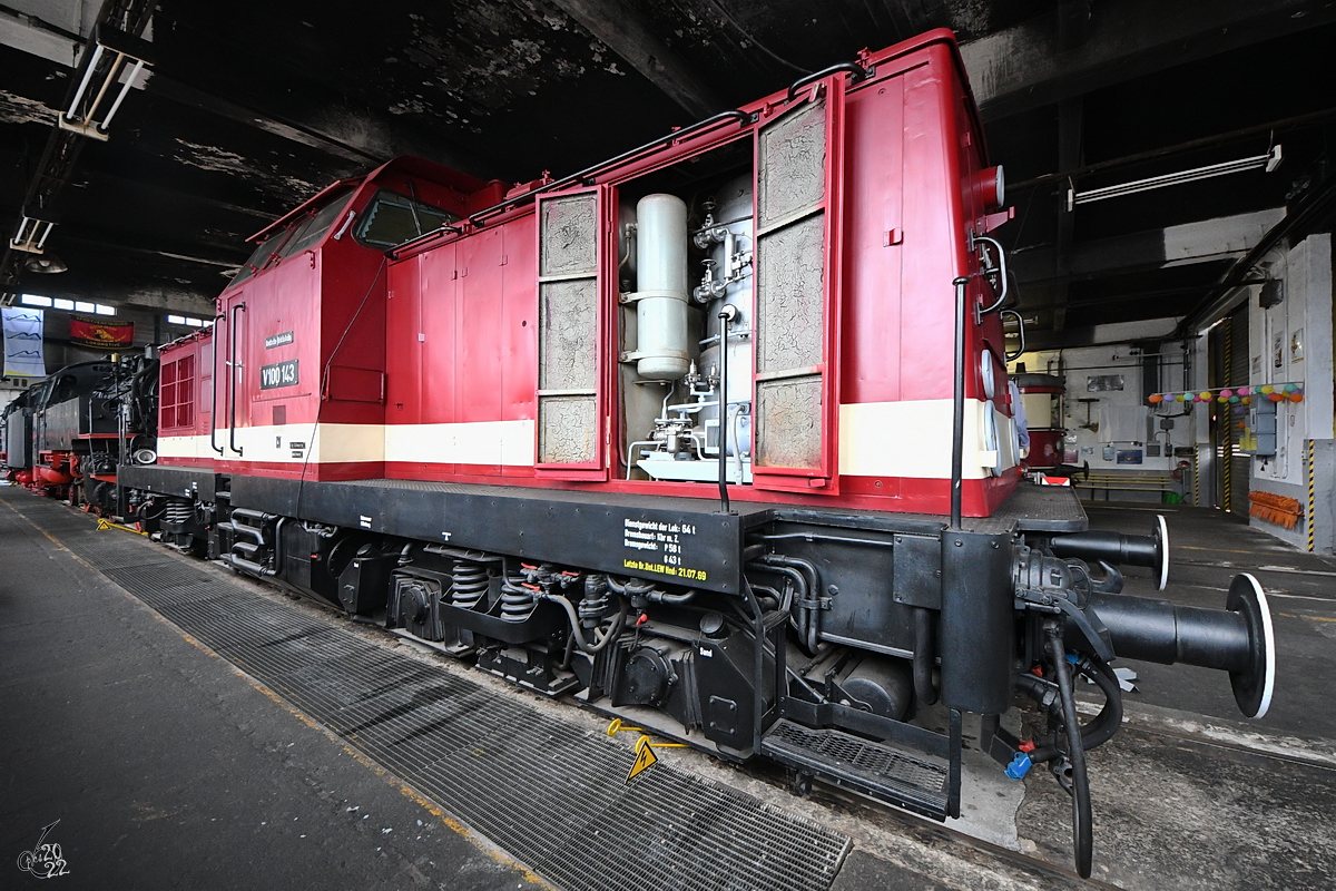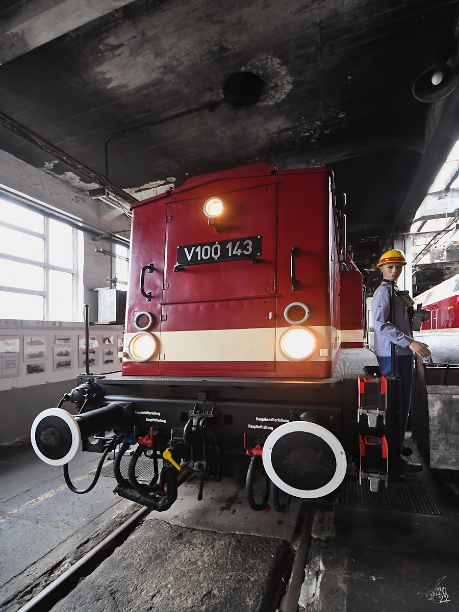 Die Diesellokomotive V100 143 wurde 1969 gebaut und war Ende März 2022 im Mecklenburgischen Eisenbahn- und Technikmuseum Schwerin ausgestellt. Christian Bremer