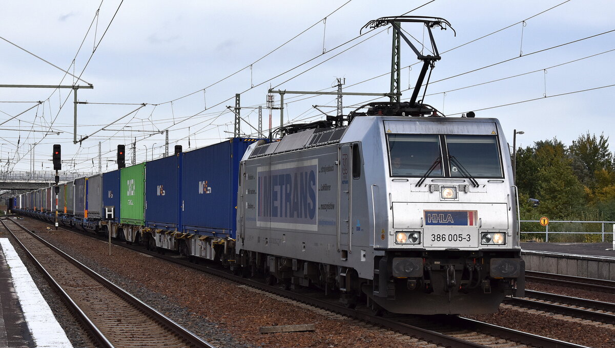 METRANS Rail s.r.o., Praha [CZ] mit ihrer "386 005-3" [NVR-Nummer: 91 54 7386 005-3 CZ-MT] und einem KLV-Zug am 14.10.24 Höhe Bahnhof Schönefeld b. Berlin. Lothar Stöckmann