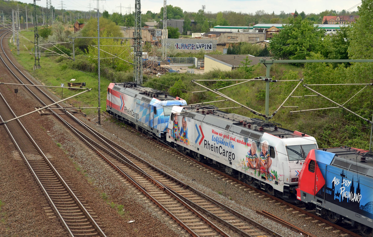 Alle drei Rheincargo-Werbeloks waren am 03.05.20 in Bitterfeld wegen eines Werkstattaufenthalts in Bitterfeld versammelt. Hier sind 185 350, 185 349 und 185 340 auf dem Bitterfelder Stumpfgleis an der Brehnaer Brücke abgestellt. Martin Schneider