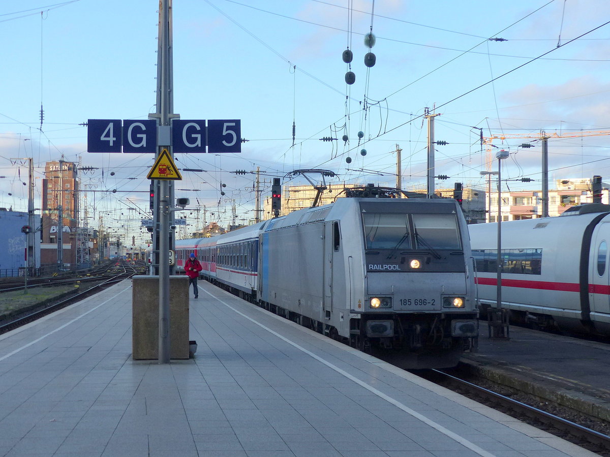 Fundsache an der Donnersberger Brücke nahe dem Münchner Hbf (25.11.19): aus 5 n-Wagen der TRI gebildete Meridian-Ersatzgarnitur mit dem Wittenberger Steuerwagen, Type Bnrdzf 483.1, Nr. 80-35190-3 an der Spitze. Offenbar wird sie für ihren nächsten Einsatz nach Kufstein aufgeheizt. Dass es sich um den Rest des am Nachmittag des 22.11. an der Hackerbrücke entgleisten 7-Wagen-Zuges handelt, kann nur vermutet werden. Hermann-Josef Weirich