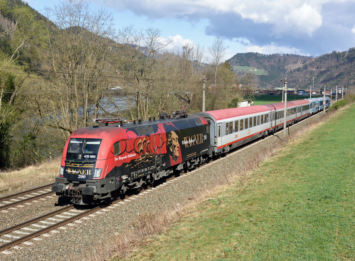Die 470 503 "Richard Wagner" war am 04.04.2021 mit dem EC 151 "Emona" auf der Relation von Wien Hauptbahnhof nach Spielfeld-Straß unterwegs, und wurde von mir bei Mautstatt fotografiert. Kriwetz Lukas
