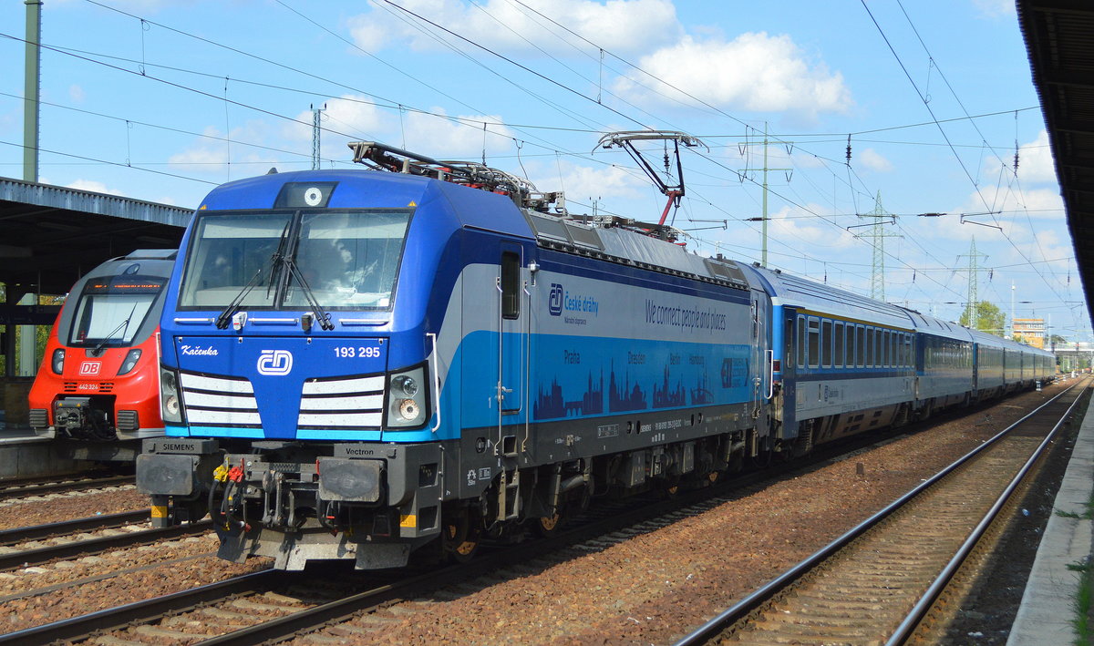 ČD - České dráhy a.s. mit der ELL Vectron "193 295" Name: Kačenka [NVR-Number: 91 80 6193 295-3 D-ELOC] mit EC Richtung Prag am 04.09.18 Bf. Flughafen Berlin-Schönefeld. Lothar Stöckmann