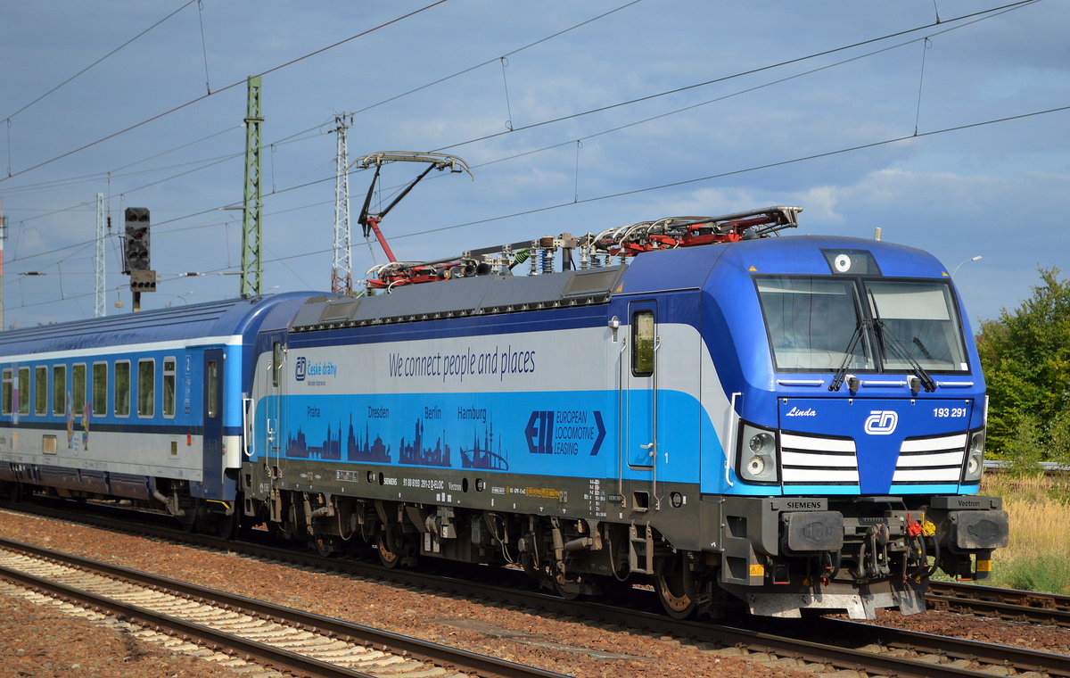 ČD - České dráhy a.s. mit der ELL Vectron "193 291" Name: Linda [NVR-Number: 91 80 6193 291-2 D-ELOC] mit EC aus Prag Richtung Berliner Innenstadt am 10.09.18 Bf. Flughafen Berlin-Schönefeld. Lothar Stöckmann