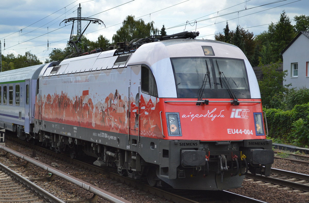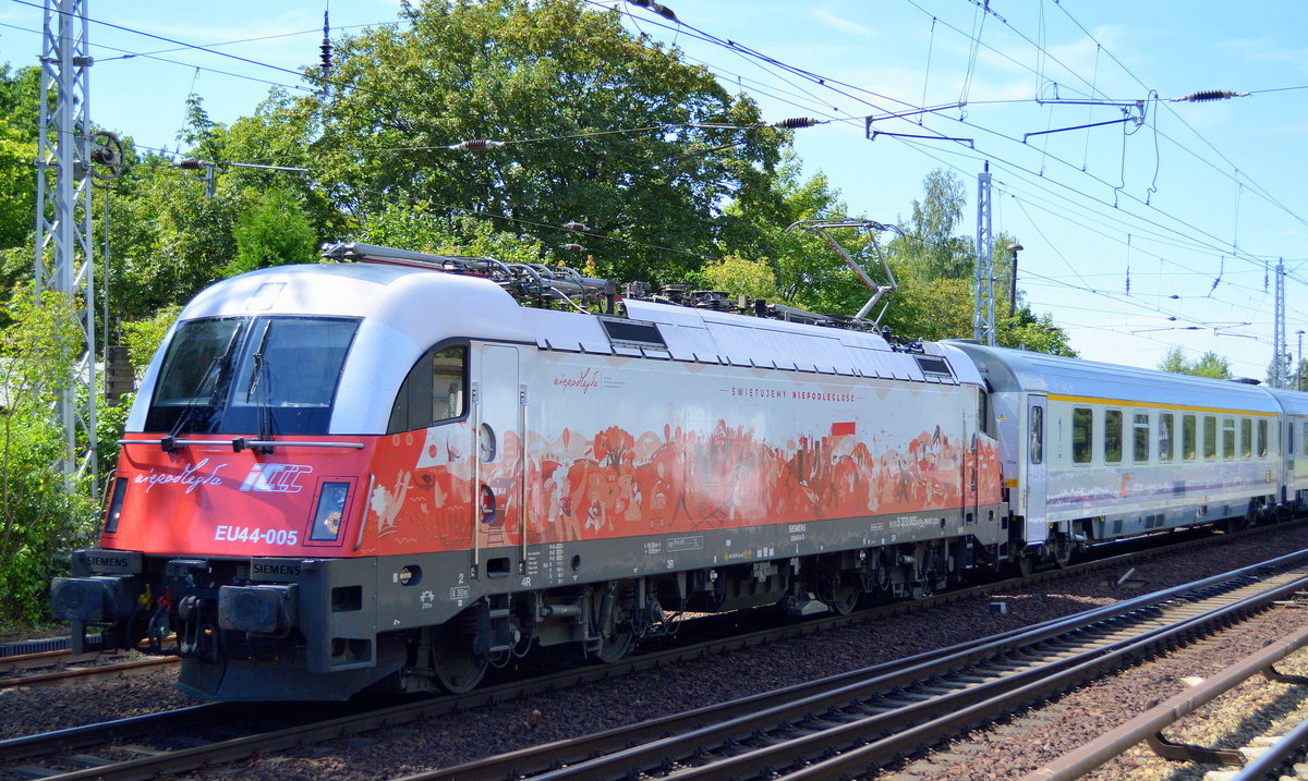 Optisch wirklich wieder mal Hingucker, hier der polnische PKPIC Husarz "EU44-004/5 370 004" [NVR-Number: 91 51 5370 004-1 PL-PKPIC] mit der neuen Werbefolie und EC aus Warschau am 18.08.18 Richtung Berliner Innenstadt in Berlin-Hirschgarten. Lothar Stöckmann