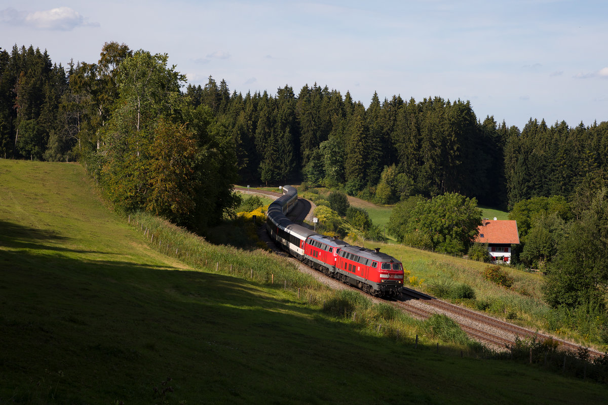 In der Nähe von Opfenbach ziehen am 06.05.2018 die 218 433-1 und 218 463-8 die in Lindau übernommenen und von Zürich kommenden Wagen des EC 193 nach München. Jürgen Vos