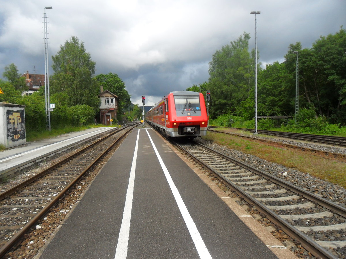 Leider nicht gewackelt hat dieser Dackel bei Sipplingen, aber die etwas seltsame Stimmung ließ einige Meter weiter die Größenverhältnisse interssant zurechtrücken. 611 019 und 611 043 vor der Kulisse des Dorfes mit der weitreichenden Wasserversorgung. Von hier wird Trinkwasser bis Stuttgart und Mannheim geliefert. April 2016. Olli