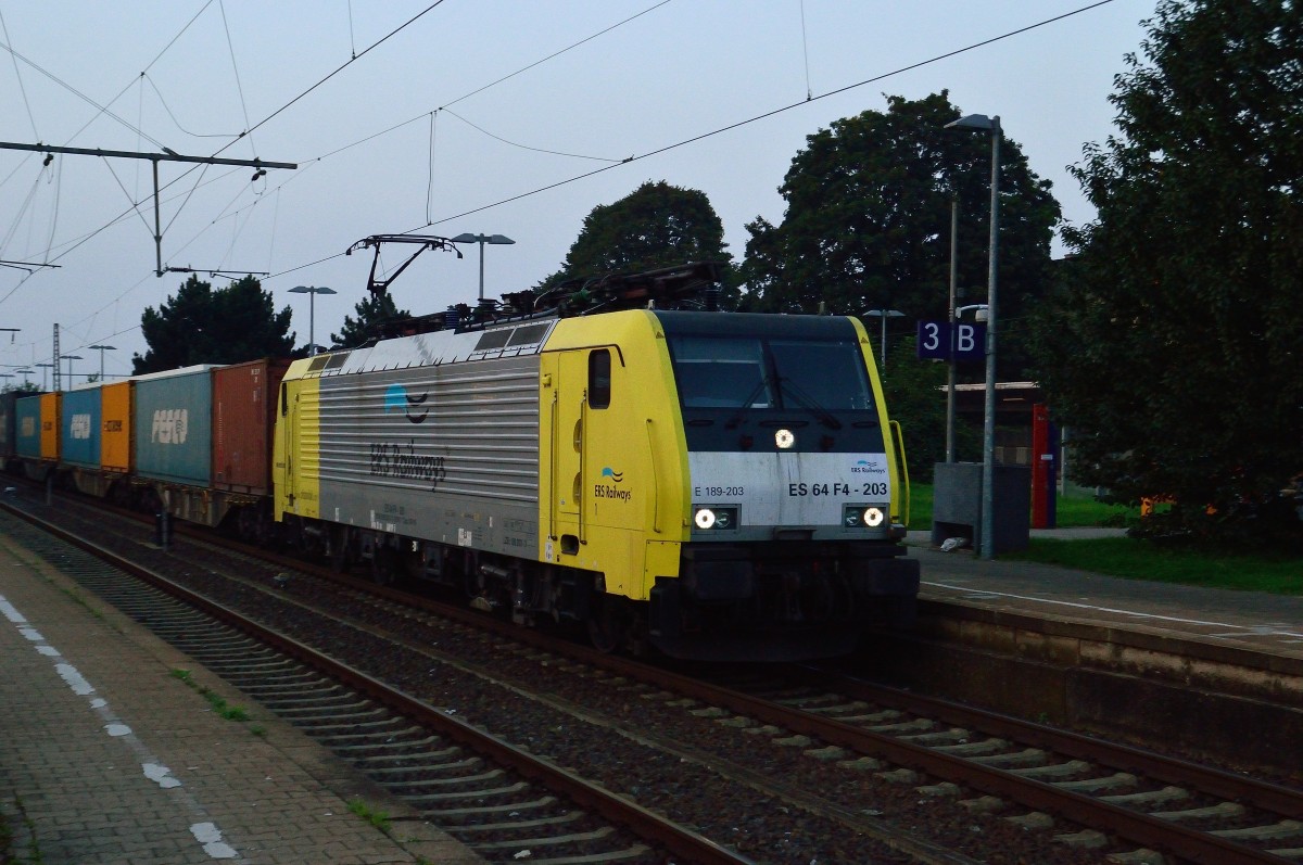 Die ERS-Railways 189 203 ist heute am 8.9.2014 mit einem Containerzug durch den